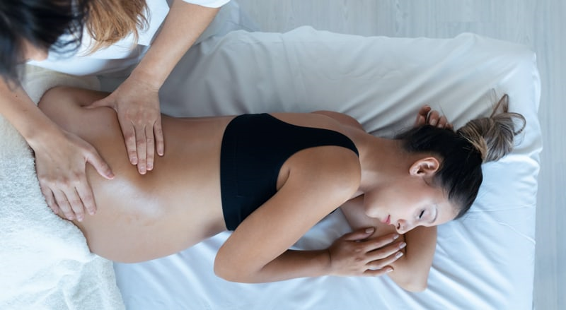 El dolor del nervio ciático afecta a muchas mujeres al final del embarazo, porque el útero se apoya en los músculos del suelo pélvico y la zona lumbar. La presión ejercida por el útero crea tensión en los músculos de las piernas, provocando hinchazón y presión en los nervios cercanos. Al dirigirse a los nervios inflamados, la terapia de masaje ayuda a liberar la tensión muscular.
